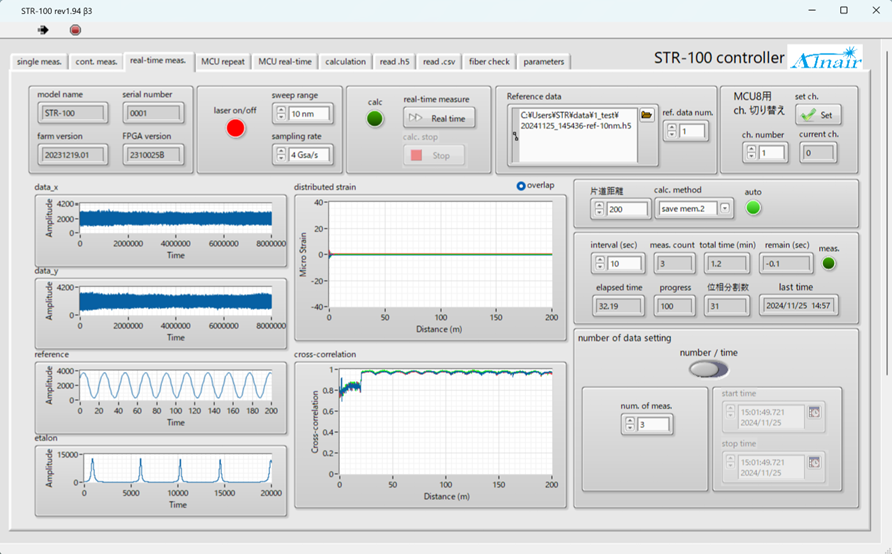 分布型ひずみ計測器「SensRay」の制御画面